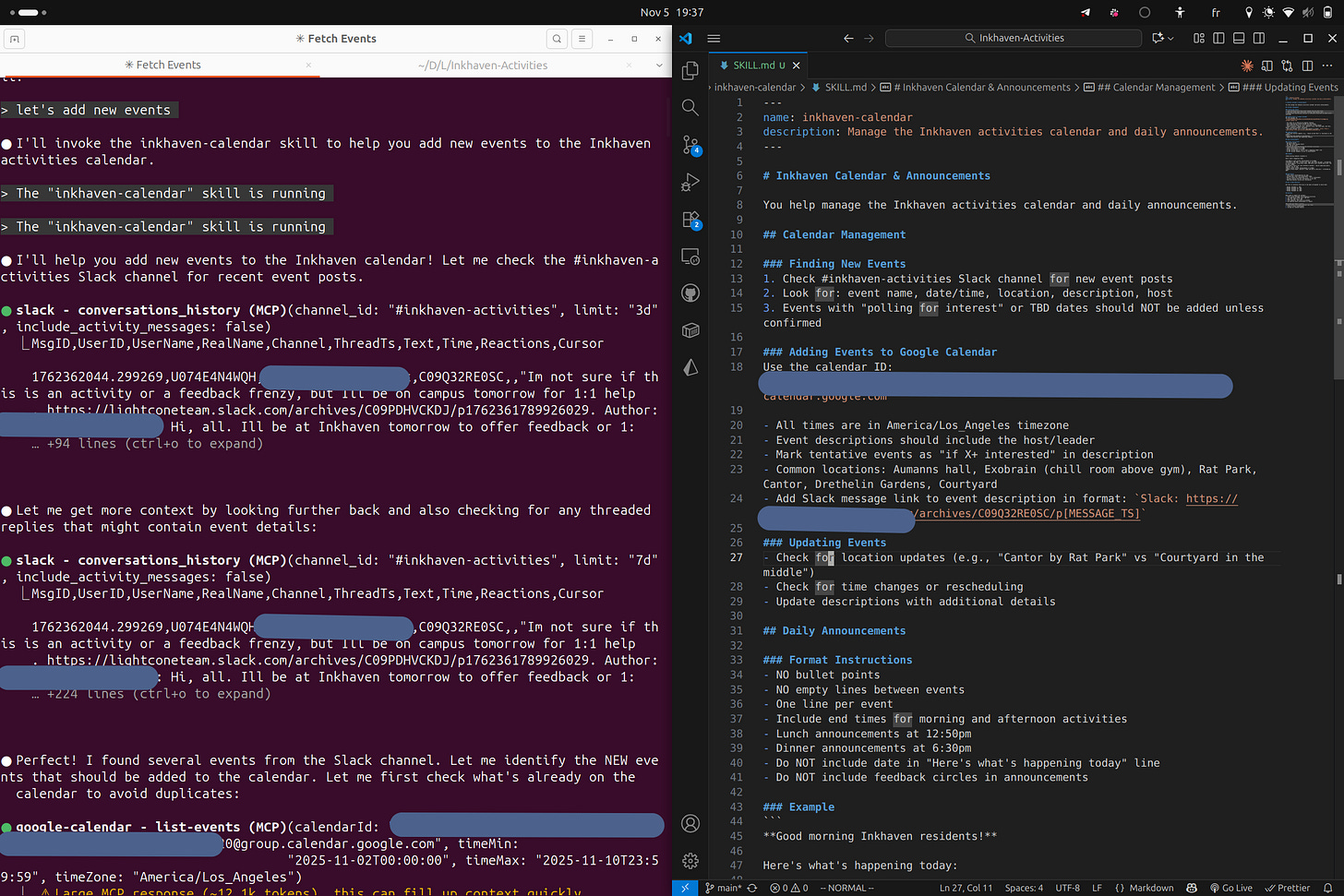 I’m responsible for keeping the Inkhaven activities calendar up to date. Activities are announced in a free form format in a Slack channel, get moved around the campus, change day, change time, get cancelled, become recurring, add requirements, etc. There are so many special cases that it makes it basically impossible to make an automated system to process the messages. Before Claude Code, my only solutions would have been either requiring people running activities to add them manually to the calendar and keep them updated, or for me to do a lot of manual work.